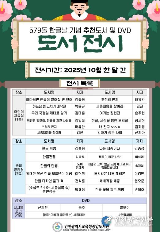 [인천광역신문] 최예준 기자 | 인천광역시교육청중앙도서관은 한글 창제 579돌을 기념해 10월 한 달 동안 ‘한글날 추천 도서 및 DVD’ 전시를 운영한다.