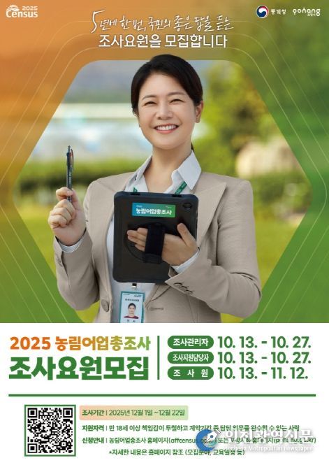 [인천광역신문] 관리자 기자 | 포항시는 오는 12월부터 실시되는 ‘2025 농림어업총조사’ 업무를 담당할 조사요원을 이달 13일부터 모집한다.