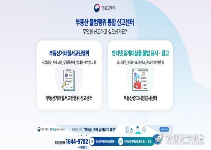 아울러, 인터넷 중개대상물 불법 표시·광고 뿐아니라, 집값담합, 시세교란(집값 띄우기 등) 등 부동산거래질서교란행위 전반을 ‘부동산 불법행위 통합 신고센터’를 통해 접수·모니터링하고 있으며, 신고된 사례에 대해서는 지자체와 협력해 엄정 대응해 나갈 계획이다.