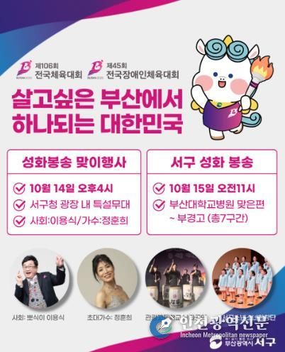 [인천광역신문] 관리자 기자 | 부산 서구는 오는 10월 14일 16시, 제106회 전국체육대회와 제45회 전국장애인체육대회의 시작을 알리는 “성화의 불꽃, 하나되는 서구”를 주제로 성화봉송 맞이행사를 서구청 광장 특설무대에서 개최한다고 밝혔다.