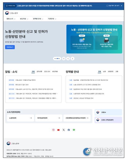오늘부터는 임시 대표 누리집 서비스를 개시(15시 이후 ~)하여 입법예고 등 공지 사항, 공고 및 고시, 보도자료 등을 확인 할 수 있으며, 고용, 노동, 산업안전분야 정책도 게시판을 통해 편리하게 찾아볼 수 있다.