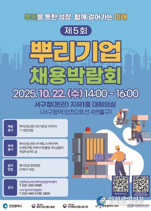 [인천광역신문] 최예준 기자 | 인천테크노파크(인천TP)는 뿌리산업 인력난 해소와 지역 고용 활성화를 위해 10월 22일 14시에 인천 서구청(본청) 대강당에서 ‘제5회 뿌리기업 채용박람회’를 개최한다.