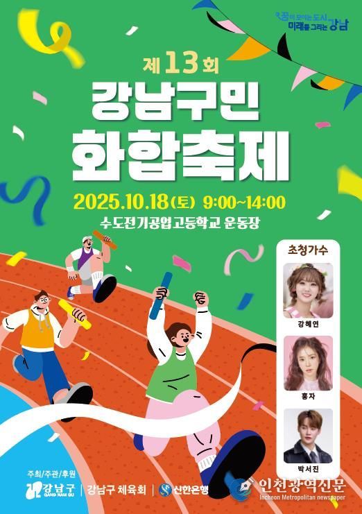 [인천광역신문] 최훈 기자 | 꿈이 모이는 도시, 미래를 그리는 강남구가 오는 10월 18일 오전 9시부터 오후 2시까지 수도전기공업고등학교 운동장에서 ‘제13회 강남구민화합축제’를 개최한다. 구민과 선수단 등 약 7,500명이 참여할 예정이며, 소통과 화합을 바탕으로 건강한 지역사회를 만드는 의미 있는 자리가 될 것으로 기대된다.