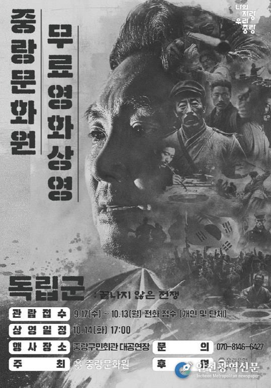 [인천광역신문] 최훈 기자 | 중랑구는 오는 10월 14일 오후 3시와 5시, 중랑구민회관 대공연장에서 광복 80주년을 기념하는 영화 ‘독립군’을 상영한다. 이번 상영회는 중랑문화원이 주최해 선열들의 희생과 숭고한 뜻을 되새기는 특별한 자리로 마련됐다.
