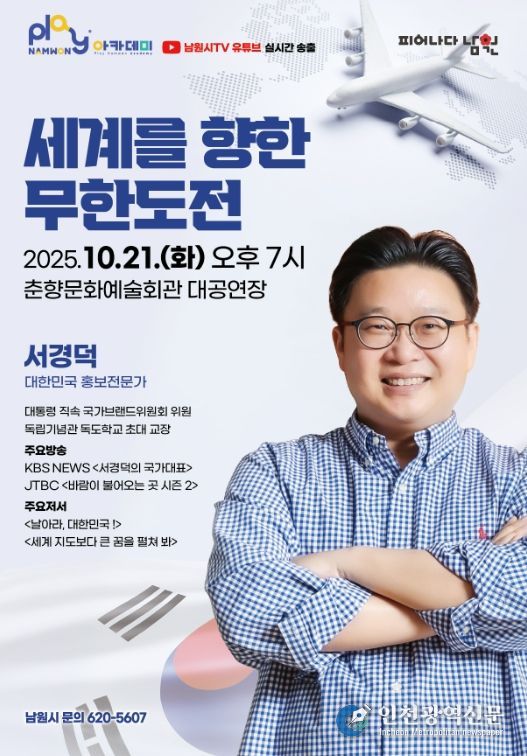 [인천광역신문] 관리자 기자 | 남원시는 오는 21일 오후 7시, 춘향문화예술회관 대공연장에서 대한민국 홍보 전문가 서경덕 교수를 초청해 “세계를 향한 무한도전”이라는 주제로 플레이(Play) 남원 아카데미를 개최한다.