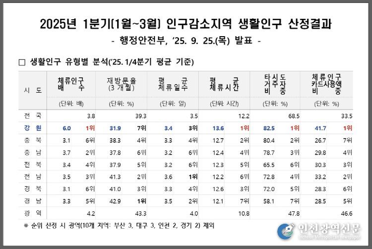 [인천광역신문] 관리자 기자 | 강원특별자치도는 행정안전부가 9월 25일 발표한 ‘2025년 1분기 인구감소지역 생활인구 산정 결과’에서 체류인구 총 2,826,012명으로 전국 최고 수준을 기록했다고 밝혔다.