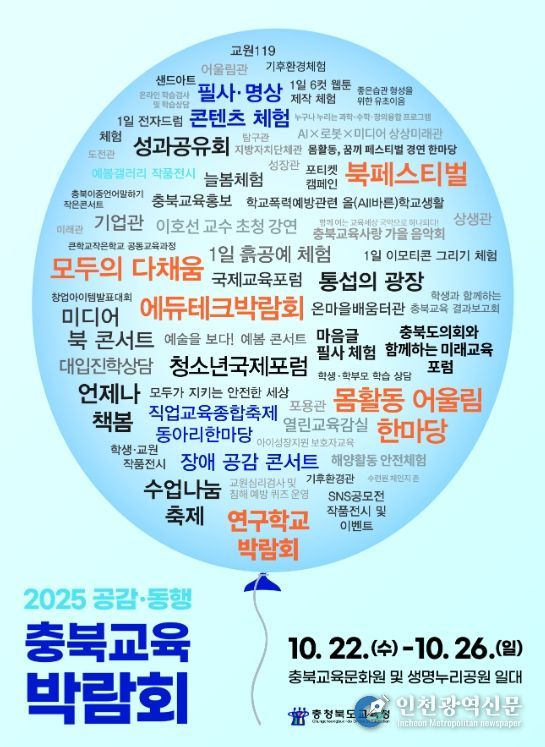 [인천광역신문] 관리자 기자 | 충청북도교육청은 오는 22일부터 26일까지 5일간 '17만의 숨결, 꿈결 바람결'이라는 슬로건 아래 충북교육의 현재를 공유하고 미래 교육의 방향을 체험하는 통합형 교육박람회인 2025 공감‧동행 충북교육박람회를 개최한다고 밝혔다.