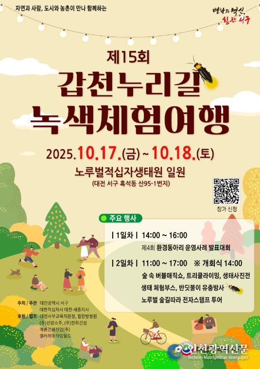 [인천광역신문] 관리자 기자 | 대전 서구는 이달 17일부터 18일까지 노루벌 적십자생태원에서 자연과 환경을 사랑하는 시민들을 위한 ‘제15회 갑천누리길 녹색체험여행’을 대한적십자사 대전·세종지사와 공동으로 개최한다.
