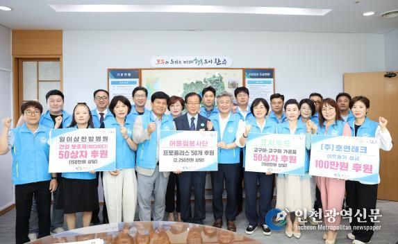 후원 내역은 어울림 봉사단 프로폴리스 50개(225만 원 상당), ㈜호연테크 성금 100만 원, 코치푸드 고구마 및 가공품 50상자(150만 원 상당), 일이삼한방병원 건강보조제 50상자(150만 원 상당)다.