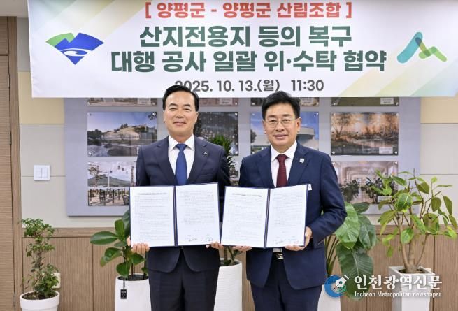 [인천광역신문] 관리자 기자 | 양평군은 지난 13일 양평군청에서 양평군산림조합과 ‘산지전용지 등의 복구 대행 공사’에 대한 위·수탁 협약을 전국 최초로 체결했다고 밝혔다.