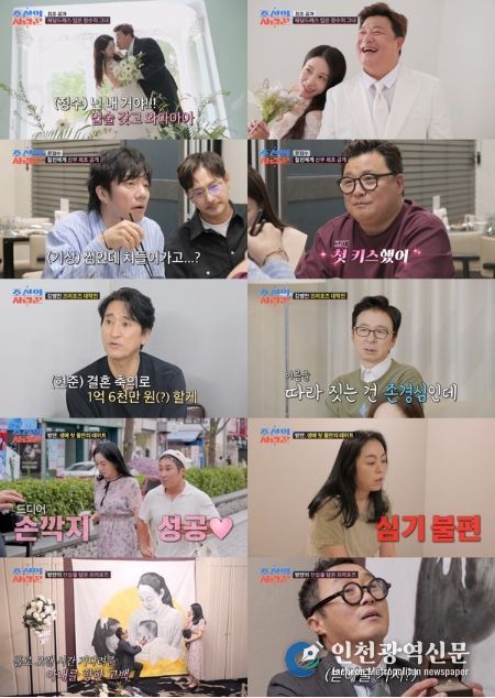 [인천광역신문] 관리자 기자 | TV CHOSUN 극사실주의 다큐 예능 ‘조선의 사랑꾼’에서 '원진서' 윤정수가 ‘찐친즈’ 배기성X임형준과 청첩장 모임을 가졌다. 또, 김병만이 결혼 전 63빌딩에서 아내에게 감동의 프러포즈를 하는 장면이 포착됐다.