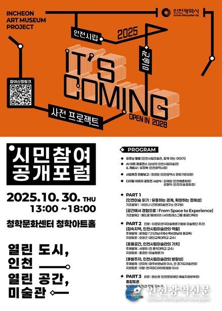 [인천광역신문] 최예준 기자 | 인천광역시는 오는 10월 30일 오후 1시부터 6시까지 청학문화센터 청학아트홀에서 인천시립미술관 사전프로젝트의 일환인 시민참여 공개포럼을 개최한다고 밝혔다.