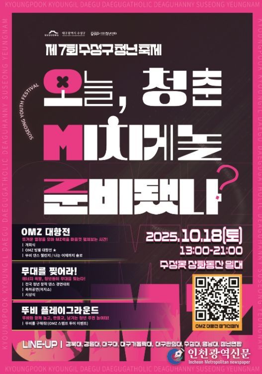 [인천광역신문] 관리자 기자 | 대구 수성구는 오는 18일 수성못 상화동산 일대에서 ‘2025 제7회 수성구 청년축제’를 개최한다.