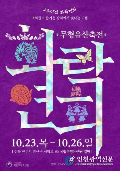 [인천광역신문] 관리자 기자 | 국가유산청 국립무형유산원(원장 박판용)은 10월 23일 오후 5시 개막식을 시작으로 26일까지 국립무형유산원(전북 전주시)에서 다양한 무형유산을 한 자리에서 경험할 수 있는 무형유산 종합축제 「2025년 무형유산축전, ‘화락연희’」를 개최한다.