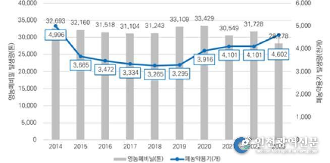 2023년 기준 경기도 영농폐기물 발생량은 영농 폐비닐이 약 3만 톤(93%), 폐농약 용기가 약 460만 개(94%)로 나타났다.