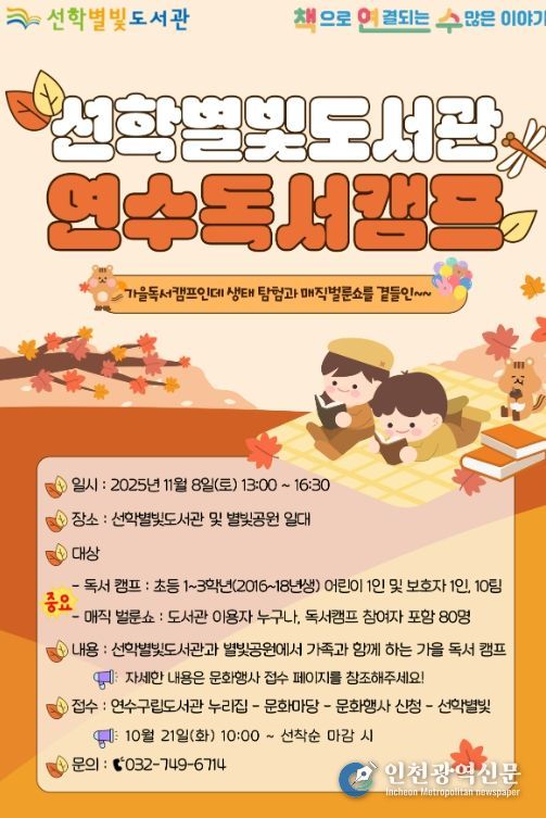 [인천광역신문] 최예준 기자 | 연수구 선학별빛도서관은 오는 11월 8일 선학별빛도서관 및 별빛공원 일대에서 지역 주민을 대상으로 ‘연수독서캠프’를 개최한다.