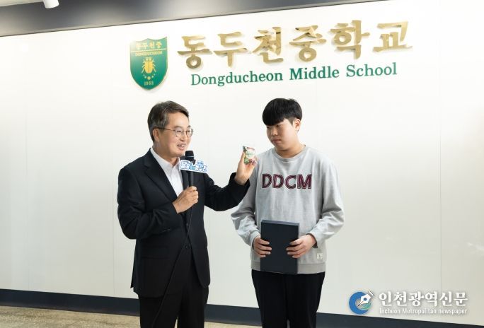 [인천광역신문] 관리자 기자 | 김동연 경기도지사가 16일 동두천중학교를 찾아 노점 할머니께 비상금을 건넨 선행으로 화제가 된 옥현일 군에게 표창을 수여했다.