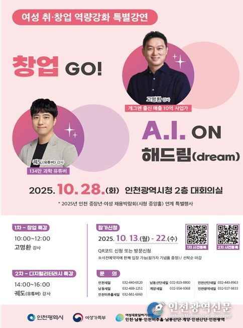 [인천광역신문] 최예준 기자 | 인천광역시가 오는 10월 28일 개최되는 ‘2025년 인천 중장년·여성 채용박람회’와 연계해 특별행사로 여성의 취·창업 역량 강화를 위한 특별강연을 시청 본관 2층 대회의실에서 개최한다고 밝혔다.