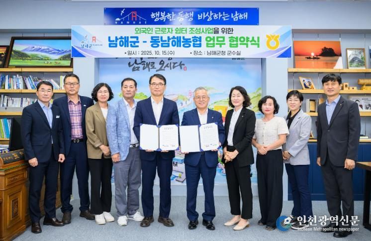 [인천광역신문] 관리자 기자 | 남해군은 15일 동남해농협이 미조 지역에서 추진하고 있는 ‘외국인 근로자 쉼터 조성사업’에 적극 협력하기로 하고 이와 관련한 업무협약을 체결했다.