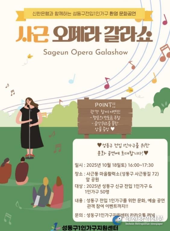 [인천광역신문] 최훈 기자 | 서울 성동구는 오는 10월 18일 토요일 오후 4시부터 5시 30분까지 사근마을활력소(성동구 사근동길 72) 앞 공원에서 1인가구를 위한 특별한 음악회 ‘사근 오페라 갈라쇼’를 개최한다고 밝혔다.