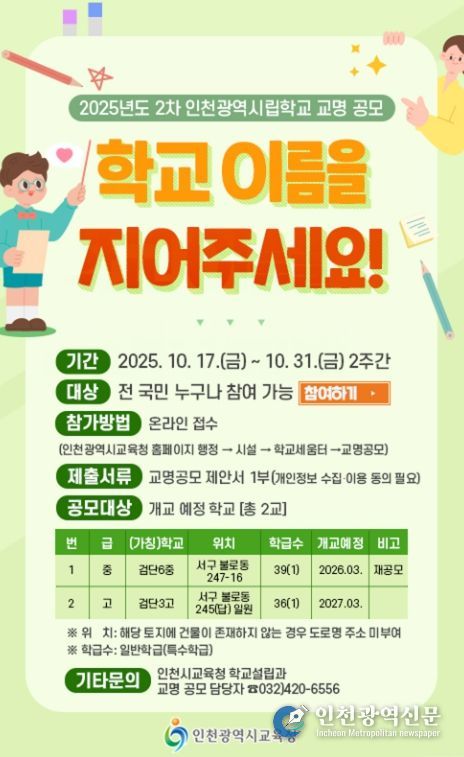[인천광역신문] 최예준 기자 | 인천광역시교육청은 10월 17일부터 31일까지 2주간 신설 중·고교 2곳의 학교명을 공모한다.