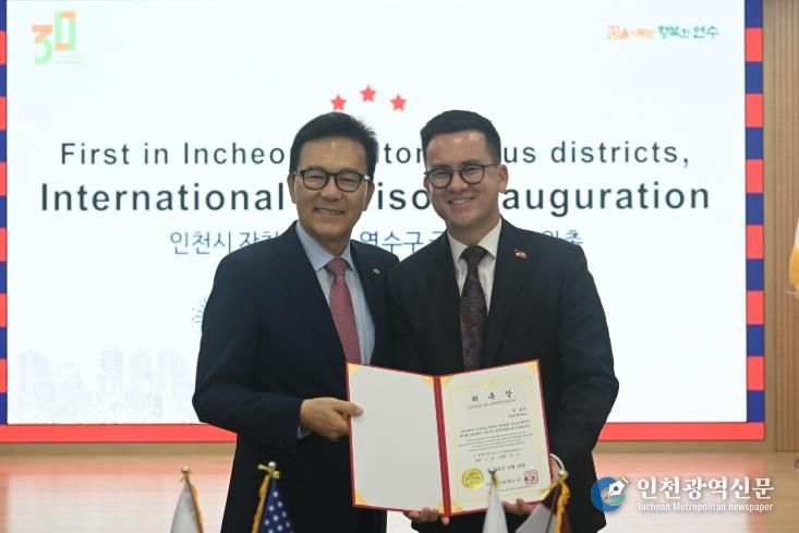 [인천광역신문] 최예준 기자 | 연수구는 지난 16일 연수구 국제자문관으로 맷 홀튼(코튼우드 하이츠시의원)과 제임스 박(유타대학교 아시아캠퍼스 대외협력처 실장)을 위촉했다.