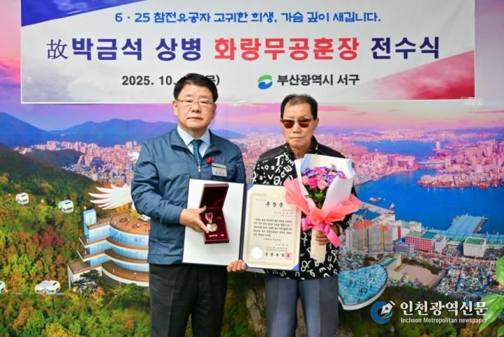 [인천광역신문] 관리자 기자 | 부산광역시 서구는 지난 16일, 6·25전쟁에 참전해 공을 세운 故박금석 님의 조카 박정진 씨에게 화랑무공훈장을 전수했다.