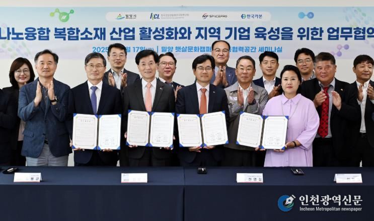 [인천광역신문] 관리자 기자 | 경남 밀양시는 17일 햇살문화캠퍼스 소통협력공간 세미나실에서 한국건설생활환경시험연구원, (주)스페이스프로, (주)한국카본과 나노융합 복합소재 산업 활성화 및 지역기업 육성을 위한 업무협약을 체결했다고 밝혔다.