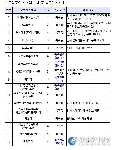 다만, 고용노동부의 노동포털 등 12개 시스템이 여전히 중단된 상황으로 임시 대표 누리집(홈페이지) 개통, 기관 대표 이메일 접수 등 대민업무에 불편을 최소화하기 위한 대체 방안을 마련·시행 중이다.