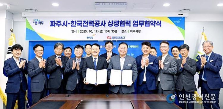 [인천광역신문] 관리자 기자 | 파주시와 한국전력공사는 지난 17일, 대규모 개발사업의 성공적인 추진과 안정적인 전력 공급을 위한 상생 협력 업무협약을 체결했다고 밝혔다.