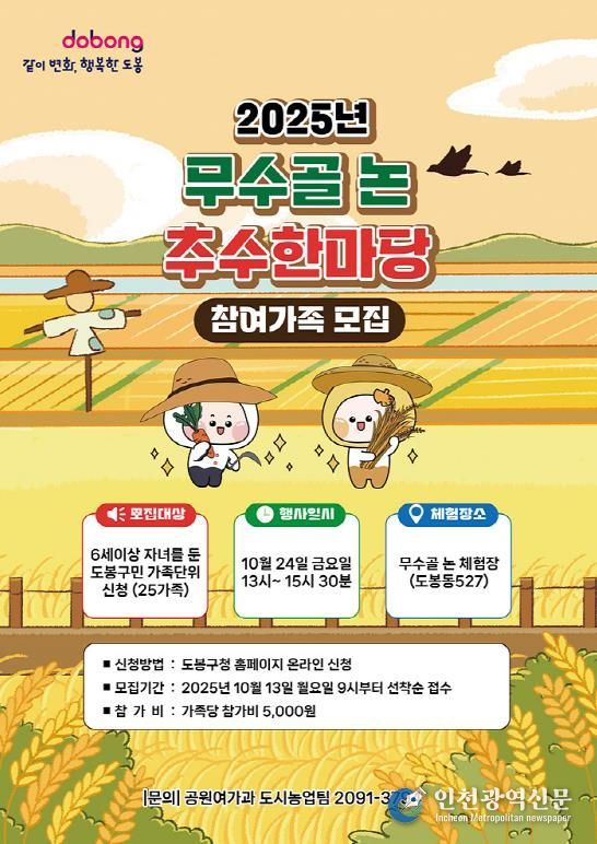 [인천광역신문] 최훈 기자 | 서울 도봉구가 오는 10월 24일 무수골 친환경 논 체험장(도봉동 527)에서 ‘무수골 논 추수한마당’ 행사를 개최한다.
