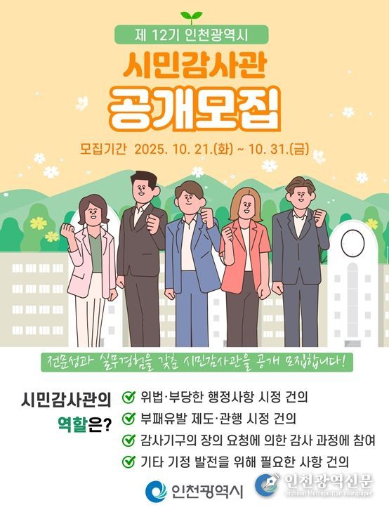 [인천광역신문] 최예준 기자 | 인천광역시는 제12기 시민감사관을 10월 21일부터 10월 31일까지 공개모집한다고 밝혔다.