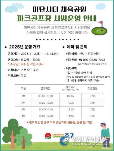 [인천광역신문] 최예준 기자 | 인천시 중구는 미단시티 체육공원 내에 ‘파크골프장’을 새로 조성하고, 오는 11월 2일부터 시범운영에 들어간다고 밝혔다.