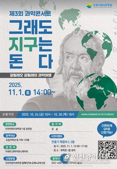 [인천광역신문] 최예준 기자 | 인천시설공단 인천어린이과학관은 오는 1일 오후 2시에 갈릴레오 갈릴레이의 삶과 과학적 업적을 탐구하는 과학강연 프로그램인 제3회 과학콘서트 “그래도 지구는 돈다-갈릴레오 갈릴레이 과학여행”을 개최한다.