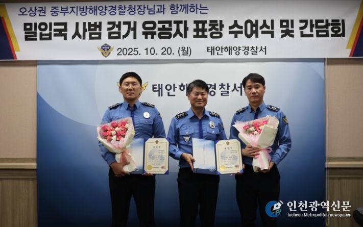 [인천광역신문] 관리자 기자 | 중부지방해양경찰청은 지난 20일, 태안해경서 소회의실에서 최근 태안 해상에서 발생한 밀입국 사범 검거와 관련해 유공자 표창 수여 및 간담회를 개최했다고 밝혔다.