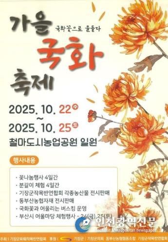 [인천광역신문] 관리자 기자 | 기장군이 오는 22일부터 25일까지 4일간 철마도시농업공원 일원에서 ‘기장군 가을 국화 축제’를 개최한다고 21일 밝혔다.