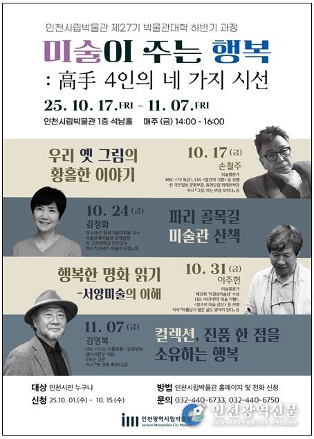 김태익 인천시 시립박물관장은 “이번 강연은 파리의 대형 미술관이 아닌, 골목 속 작은 미술관을 통해 시민들이 미술의 새로운 행복을 발견할 수 있도록 기획했다”며 “현장 전문가의 생생한 이야기로 미술을 삶 가까이에서 느낄 수 있는 특별한 시간이 될 것”이라고 전했다.