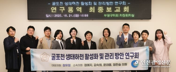 [인천광역신문] 최예준 기자 | 인천 부평구의회 의원연구단체인 ‘굴포천 생태하천 활성화 및 관리 방안 연구회(대표의원: 정유정)’는 21일 부평구의회 2층 의정회의실에서 ‘굴포천 생태하천 활성화 및 관리 방안 연구’를 과업으로 하는 연구용역 최종 보고회를 개최했다.