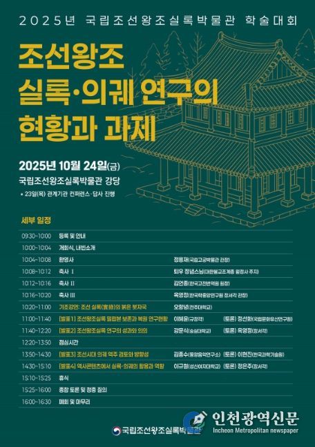 [인천광역신문] 관리자 기자 | 국가유산청 국립고궁박물관 국립조선왕조실록박물관은 10월 23일부터 24일까지 실록박물관 등 강원도 평창 일원에서 ‘조선왕조실록·의궤 연구의 현황과 과제’를 주제로 학술행사를 개최한다.