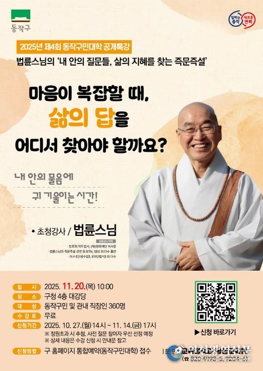 [인천광역신문] 최훈 기자 | 동작구가 내달 20일 오전 10시, 구청 신청사 4층 대강당에서 ‘내 안의 질문들, 삶의 지혜를 찾는 즉문즉설’을 주제로 공개 특강을 개최한다고 밝혔다.