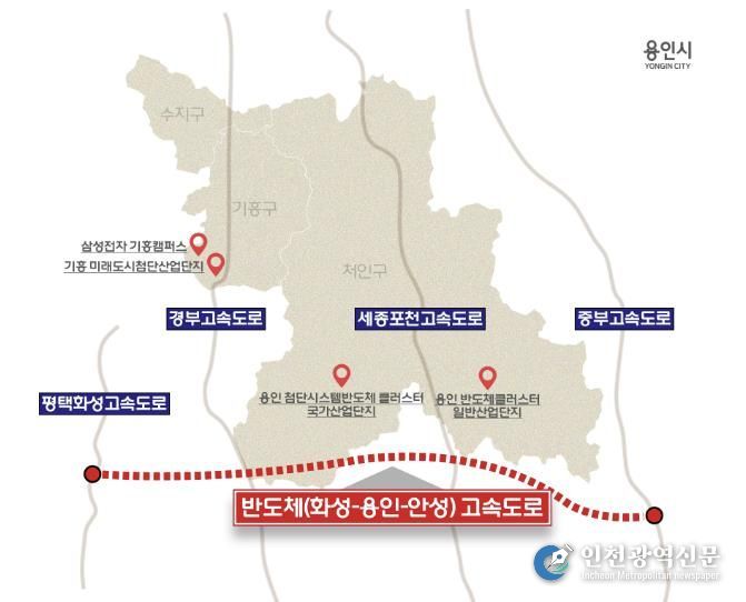 ‘반도체 고속도로’는 이동·남사읍의 첨단시스템반도체 국가산업단지와 원삼면의 용인반도체클러스터를 동서로 연결하는 핵심 산업축으로 경부고속도로, 국토45호선, 포천~세종 고속도로, 중부고속도로와 연결된다.