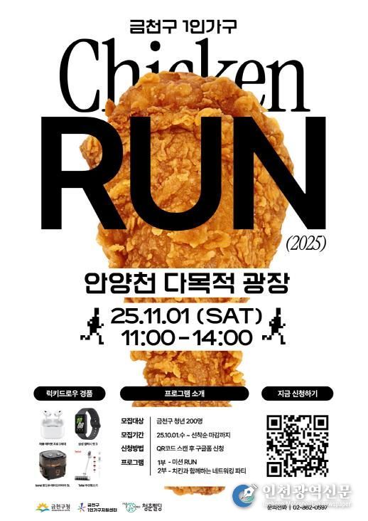 [인천광역신문] 최훈 기자 | 금천구는 오는 11월 1일 오전 11시, 안양천 농구장에서 청년 1인가구를 대상으로 걷기 챌린지 ‘치킨런’ 행사를 개최한다고 밝혔다.