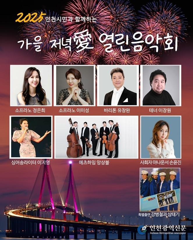 행사 관계자는 “이번 열린음악회는 인천시민이 함께 즐기며 예술의 향기를 나누는 소통의 무대가 될 것”이라며 “깊어가는 가을밤, 시민 모두가 음악으로 하나 되는 시간이 되길 바란다”고 전했다