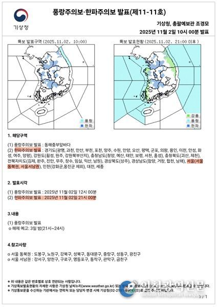 이번 한파주의보는 서울 동북권(도봉구‧노원구‧강북구‧성북구‧동대문구‧중랑구‧성동구‧광진구)과 서남권(강서구‧양천구‧구로구‧영등포구‧동작구‧관악구‧금천구) 15개 자치구에 발효된다.