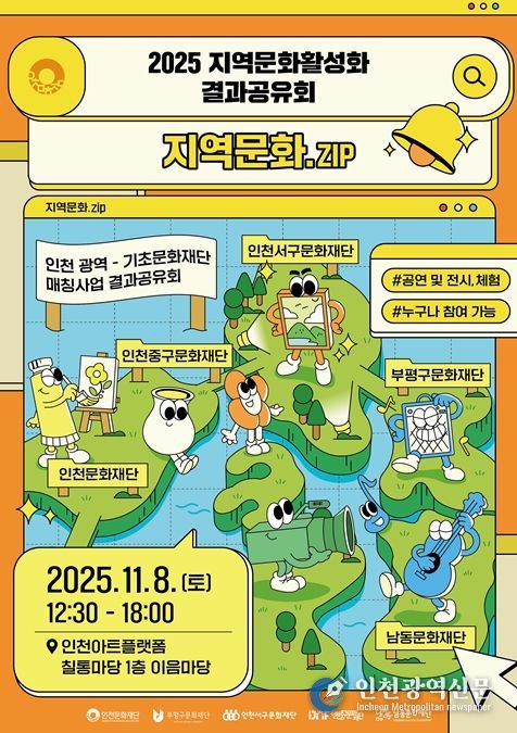 [인천광역신문] 최예준 기자 | 인천문화재단은 오는 11월 8일 12시 30분부터 18시까지 인천아트플랫폼 칠통마당 1층 이음마당에서 광역-기초문화재단 협력사업'2025 지역문화활성화 결과공유회 '지역문화.zip''을 개최한다.