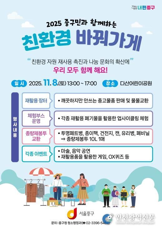 [인천광역신문] 최훈 기자 | 서울 중구는 오는 11월 8일 오후 1시부터 5시까지, 다산어린이공원에서 ‘2025년 중구민과 함께하는 친환경 바꿔가게’ 행사를 개최한다.