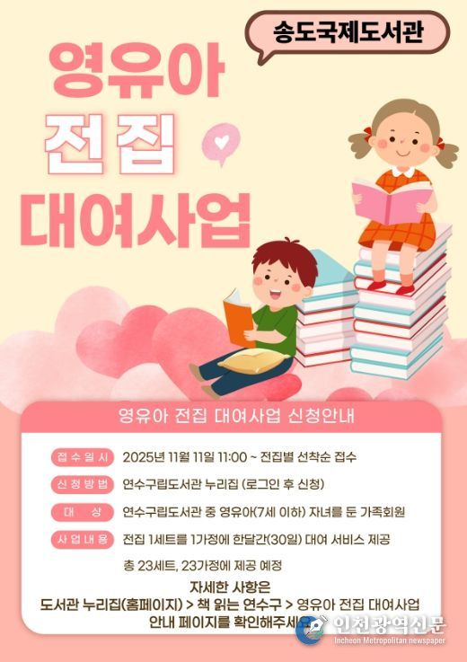[인천광역신문] 최예준 기자 | 연수구송도국제도서관은 오는 11일부터 7세 이하 영·유아 가정을 대상으로 ‘전집 대여 서비스’를 새롭게 운영한다.