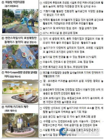올해에는 전국 8만 4천여 개의 어린이놀이시설 중 시도 및 시도 교육청에서 추천한 46개 시설을 대상으로, 전문가·현장 심사*를 거쳐 최종 8곳을 선정했다.