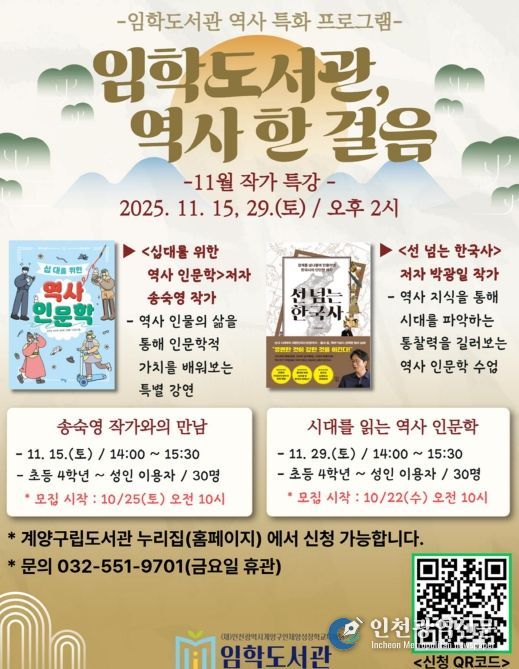 [인천광역신문] 최예준 기자 | 인천 계양구 임학도서관은 유명도서의 저자를 초빙해 역사에 대해 함께 배워보는 ‘임학도서관 역사 한걸음 : 11월 특별 강연’을 운영한다고 밝혔다.