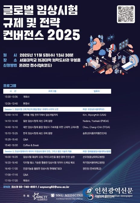 [인천광역신문] 관리자 기자 | 식품의약품안전처는 글로벌 임상시험 규제동향과 인공지능(AI) 등 첨단기술 적용 임상시험 전략 등을 논의하기 위한 ‘글로벌 임상시험 규제 및 전략 컨버전스 2025’를 11월 5일 서울대학교 의과대학 의학도서관 우봉홀(서울시 종로구 소재)에서 개최한다.